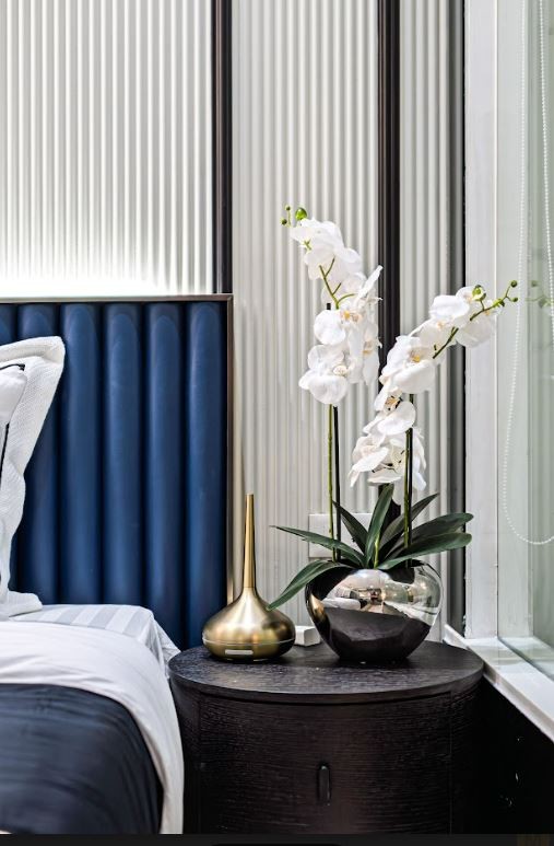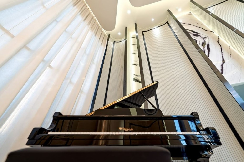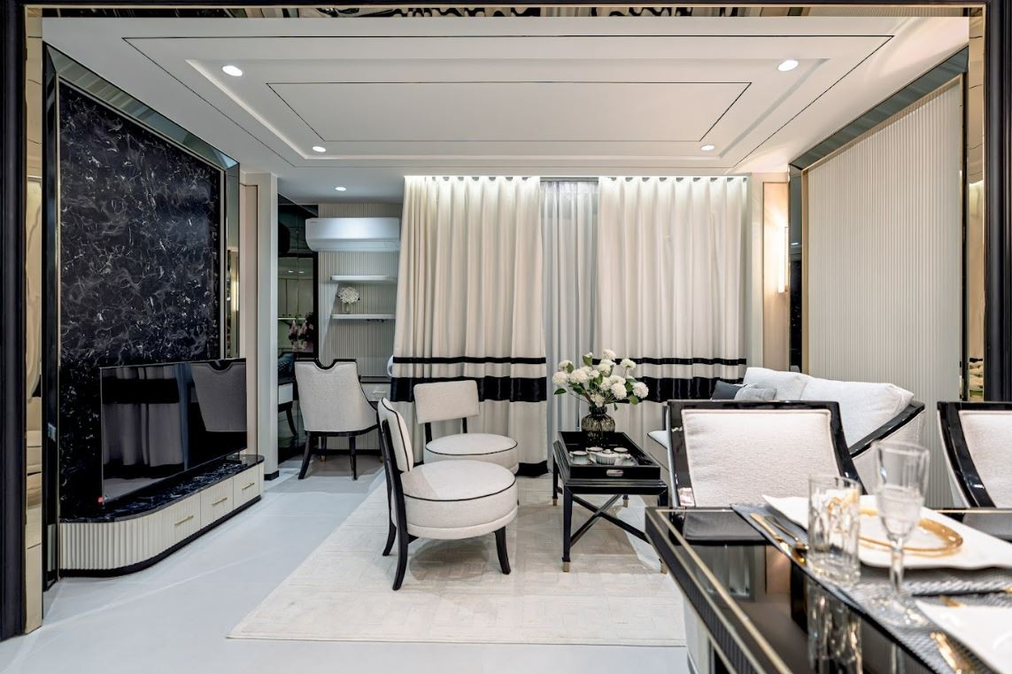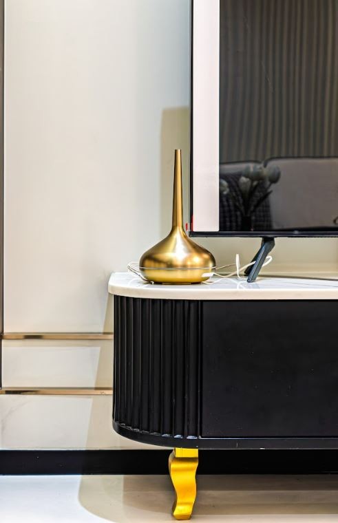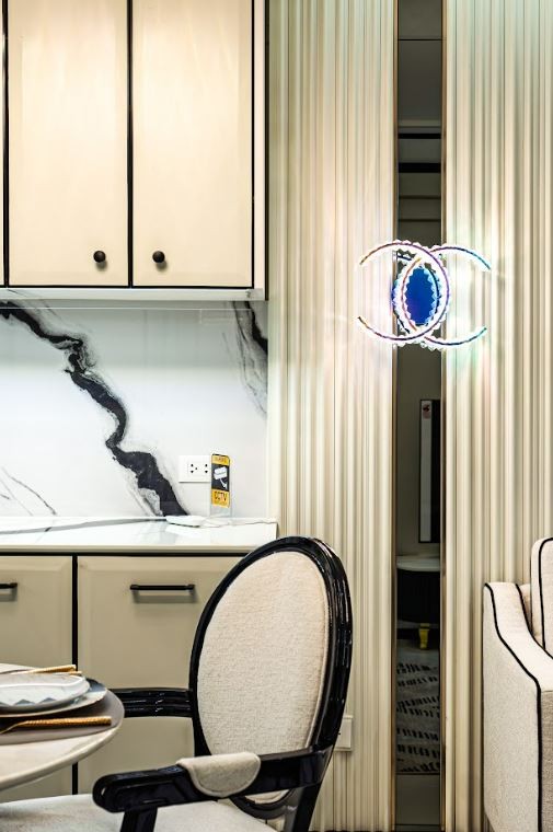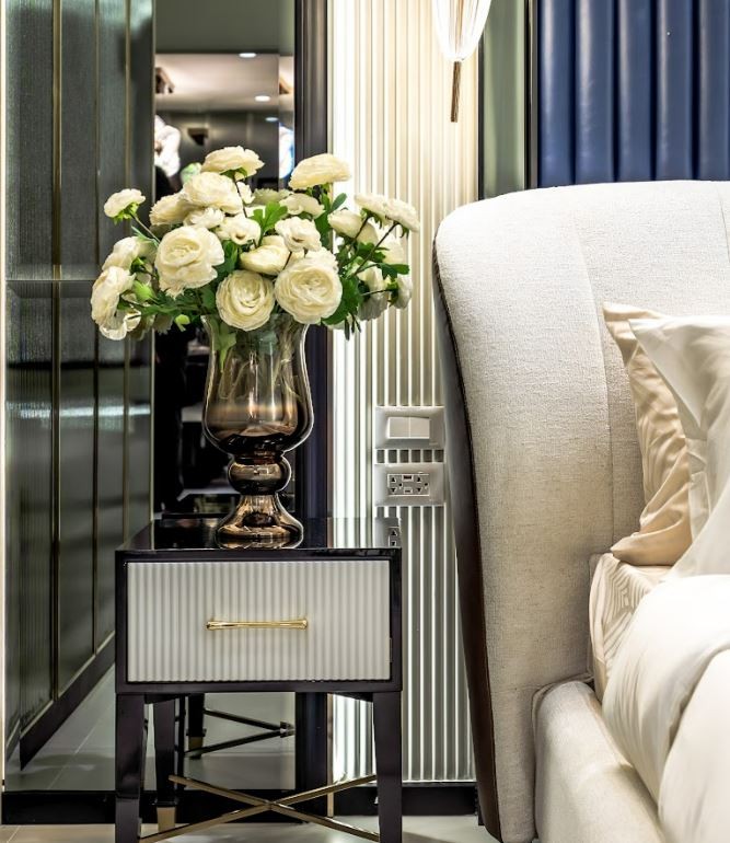 Furniture combines refined forms with a calm, elegant palette. Custom cabinetry and wardrobes feature clean lines and soft contours, complemented by premium finishes. Textured panels, marble accents, and high-quality, eco-friendly materials create a cohesive, sophisticated feel throughout.
